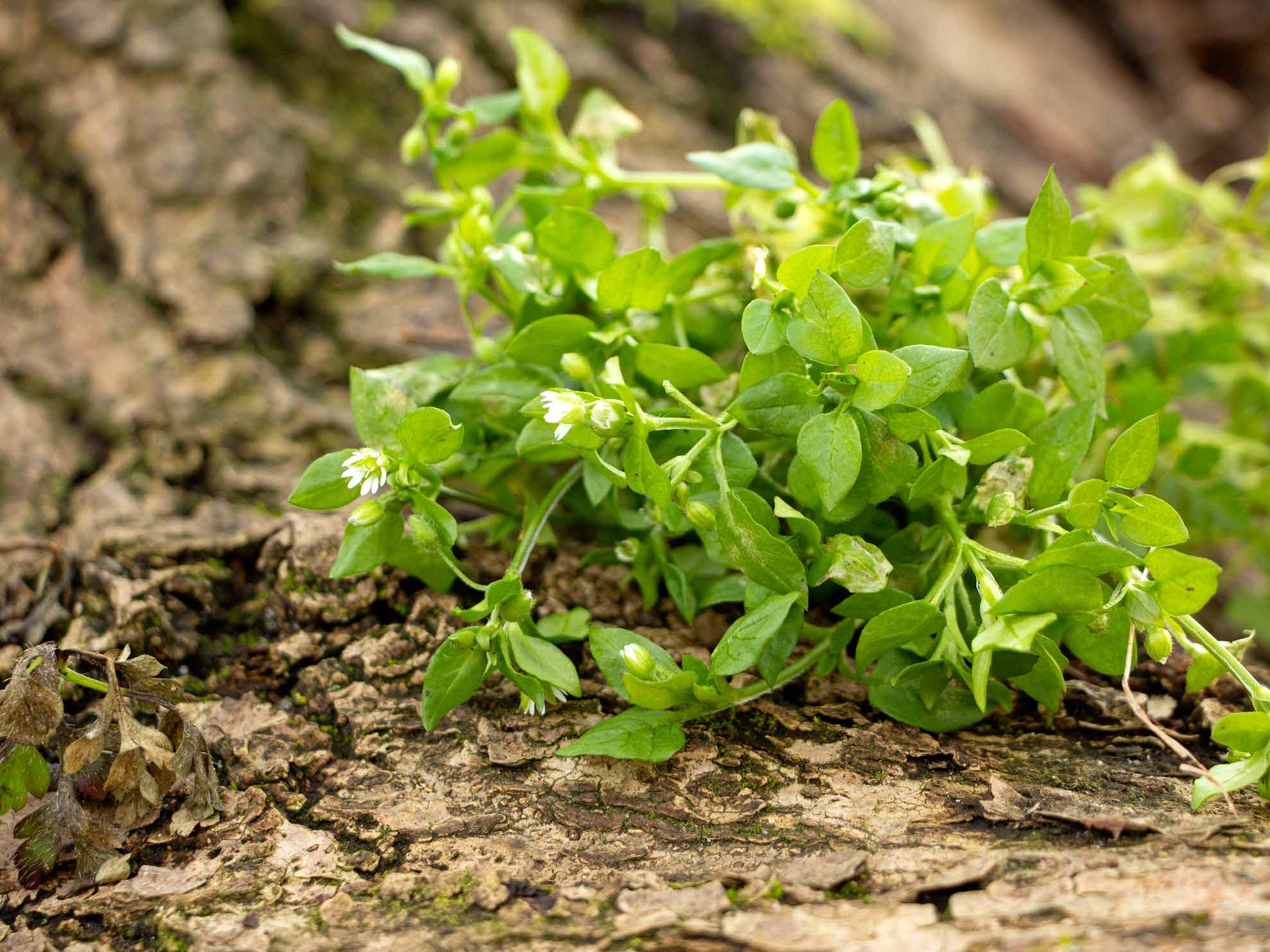Stellaria media ist eine robuste Pflanze, die ab 4° C keimt und das ganze Jahr üppig wächst und blüht. Bis zu vier Generationen bringt eine Pflanze jährlich hervor. Die Pflanze gehört zu den Nelkengewächsen und wächst an Wegrändern, Äckern, Weinbergen, Gärten, Schuttplätzen und bevorzugt nährstoffreiche, feuchte Böden, gern in schattiger Lage. Die Vogelmiere hat 5 weiße Kronblätter, die zweigeteilt sind und einem Stern ähneln. Die grünen Kelchblätter sind nicht viel kleiner als die Kronblätter und damit auch ein Erkennungsmerkmal der Pflanze. Ihre herzförmigen Blätter stehen sich gegenüber, ihre Blüten wachsen aus den Blattachsen heraus. Ein typisches Erkennungsmerkmal der Vogelmiere ist der einseitige Haarstreifen entlang des Stängels, den du gut erkennst, wenn du die Pflanze gegen das Licht hältst. Am Haarstreifen sammelt sich das Tauwasser, das zu den Blattachsen hinunter läuft und dann von der Pflanze aufgenommen wird.